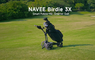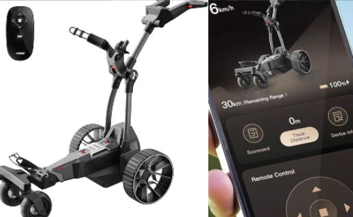 Here is a smart golf cart that can automatically follow you. The NAVEE Birdie 3X has a Ultra-Wideband (UWB) system that offers cm level accuracy as it tracks the player’s location in real-time. It has 11-inch rear wheels and 6″ front wheels. It is driven by dual 240W peak motors, so it can take on 25% inclines, sand, grass, and gravel.