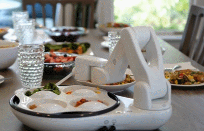This robot has a reusable plate and spoons. Obi doesn’t take a lot of space and has an anti-slip surface. It weighs only 7ls. It lasts up to 4 hours on battery. It comes with collision detection for safe operation.