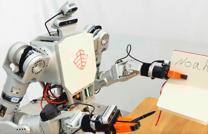 This robot has a modular design with 3D printed and CNC machined aluminum alloy parts. Its modular design facilitates easy repairs. It features 2x 7DoF arms.