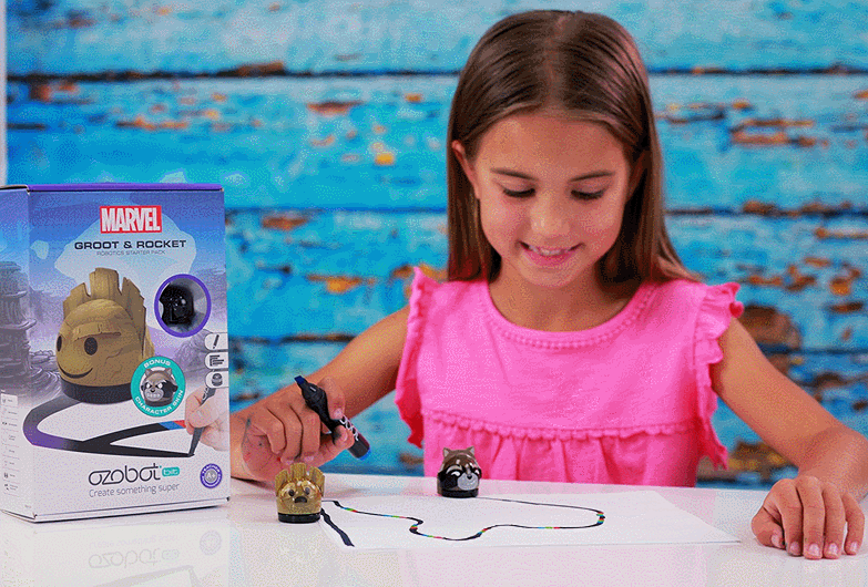 Meet the Ozobot 2.0 Bit Guardians of the Galaxy: an educational robot kit with Groot and Rocket skins that teaches your kids programming and gets them familiar with robots and technology. You get an app for iOS and Android devices to interact with the robot.