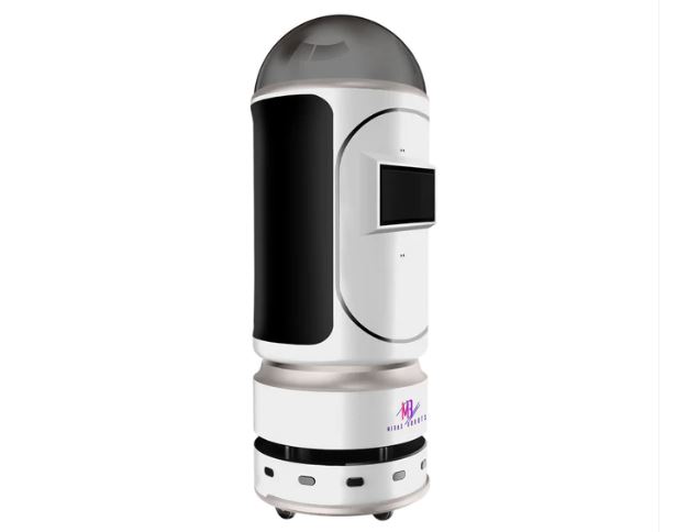 This is Paul: an indoor security robot with LiDAR, full-HD infrared rotating camera with night vision, and security alarm. It is Android based and has 360-degree coverage. It has manual and auto charging capability. Paul supports cloud memory storage but also supports memory cards.