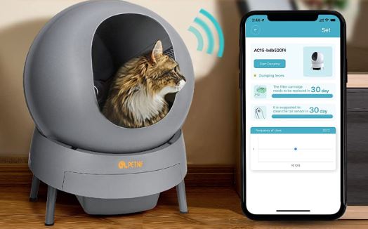 The PetNF Robotic Litter Box comes with WiFi connectivity. You will get notifications on waste box and carbon filter status. You can use this machine with a variety of clumping litter. It has max capacity of 2.5-3L. The dome is removable for easy cleaning.