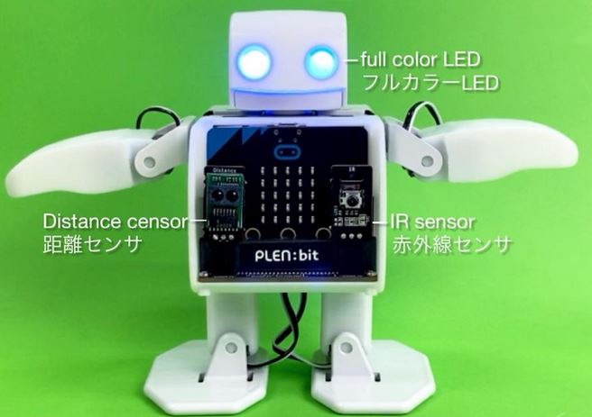 Meet the PLEN:bit v2: an educational robot powered by micro:bit v2 that teaches you more about programming. It can be programmed from any browser using the MakeCode Block Editor. This robot has 8 servo motors, infrared/distance sensors and LED eyes. It measures 13cm long.