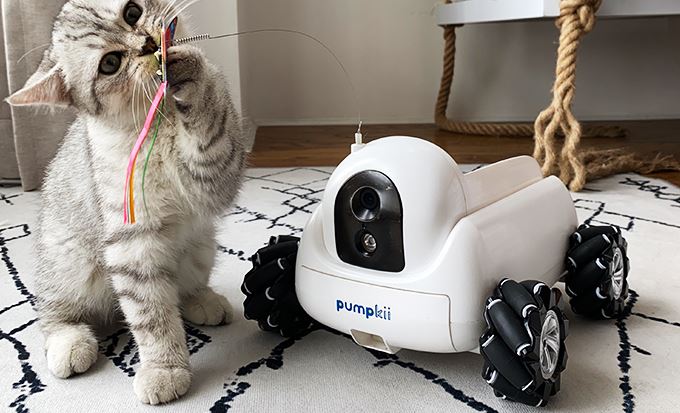 Meet the Pumpkii: a cute modular pet robot that makes it easier to stay in touch with your pets. It has mecanum wheels, so you can move it in all directions. It has a 720p camera with a 120-degree wide angle lens. Pumpkii comes ready to go out of the box but can be enhanced with modular accessories, such as a treat dispenser, mechanical arm, and cat teaser. It also has a snack bucket to carry 100 pieces of treat for your pet.
