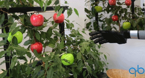 Recognition by AI and picking red apples with a qb SoftHand Industry