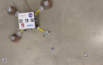 This is the ReachBot: a climbing robot designed for planetary exploration and microgravity environments. It has a small body with multiple extendable space booms as arms. It rolls on 4 bearings. This robot can react and extend its arm to interact with its environment. It can also anchor its 3 arms to haul a rock.