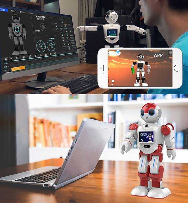 Here is another humanoid robot you can control from your iOS or Android device. The RGKNSE Intelligent Robot features WiFi connectivity and Bluetooth. It also links via a SIM card. It comes with a camera and display to allow you to chat with others.