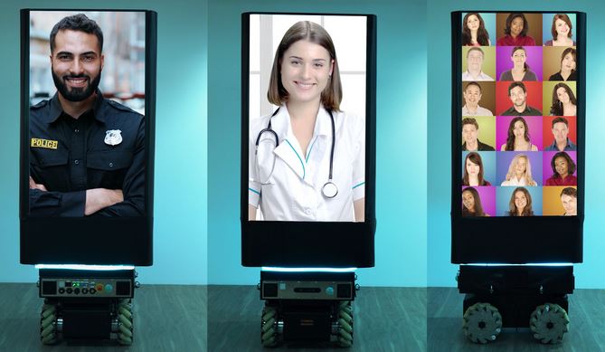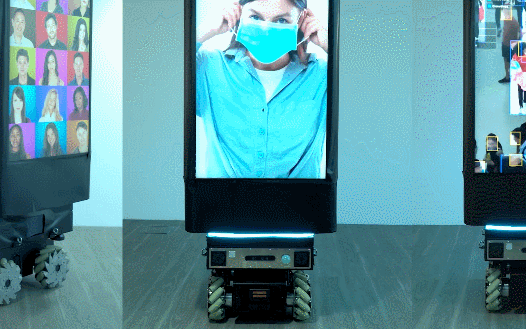 Meet the RoboAds: a mobile kiosk with 4 x 55-Inch screens in 4K resolution, speakers, and microphones. It can be used to display videos or for teleconferencing. It has 2 LiDAR scanners for 360-degree obstacle avoidance.
