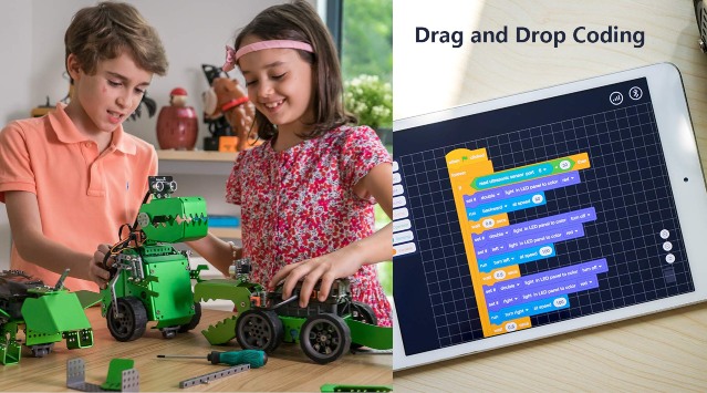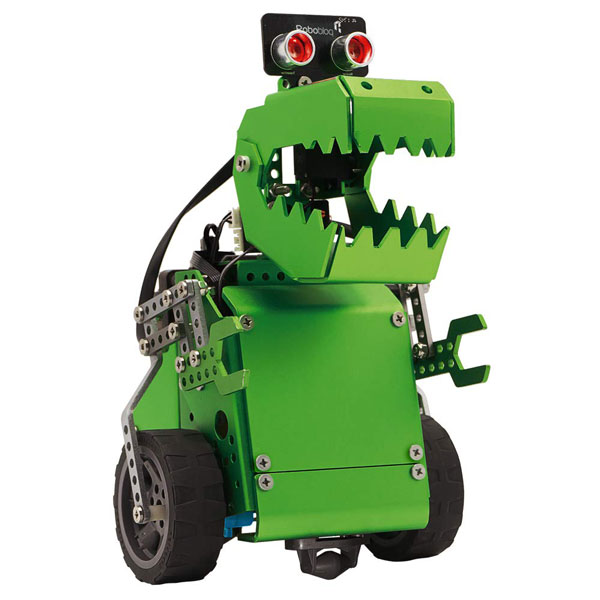 Meet the Robobloq Q- Dino: a 2-in-1 robot kit for kids that teaches them how to code. It comes with 231 pieces can be used as a dinosaur and crocodile robot. The Robobloq Q- Dino has a DC motor driver, ultrasonic sensor, and a Qmind microcontroller.