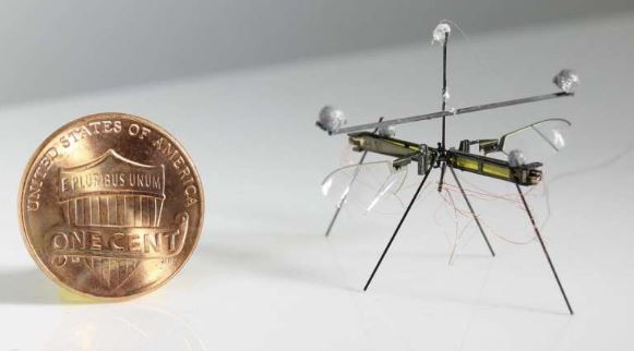 Meet the RoboFly: an insect-sized robot that can fly and drift on water. It flaps its wing to move in the air and on the ground. This micro-robot was developed by researchers at the University of Washington with a single, folded laminate sheet, so it is not difficult to assemble. Its wings are driven by piezoelectric actuators.