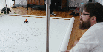 Here is a robotic mural installation with 4 ink equipped robots, each with their own autonomous drawing behavior, that react to interactions from visitors. As the artists behind it explain: