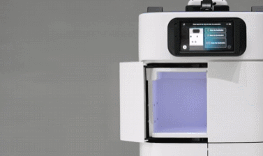This robot can also use an RFID key. It features automatic docking. It has an app that customers can use to complete their order. This robot has max speed 1.2m/s.