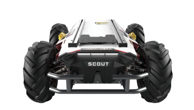 Here is another versatile UGV for industrial applications. The SCOUT 2.0 UGV has a max range of 15km and speed of 6km/h. It has slide rails for quick loading of sensors, IMUs, and cameras. It has a metal body and 4 x 400w brushless servo motors.