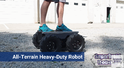 Here is another heavy duty robot ready for rough terrain. The SDRRobots Heavy-Duty All-Terrain Wheeled Robot can carry over 200 pounds over rough terrain. It has a max speed of 3mph and uses 4 wheelchair motors.