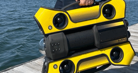 This is the SeaDrone Mini: a portable, app controlled personal underwater robot with a modular design that can be used to grab and manipulate objects. It has a max speed of 3 knots and depth rating of 300m. This robot weighs 33lbs. The SeaDrone Mini has a map based mission planning iOS app.