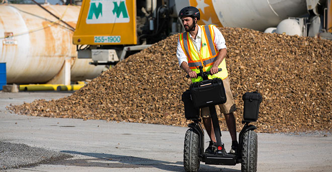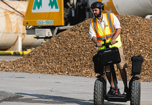 Meet the Segway x2 SE: a commercial personal transporter for construction sites and other challenging environments. It has ATV style tires to handle any terrain. The machine has a max speed of 12.5mph and a range of 12 miles. The wide base provides riders with a comfortable ride.