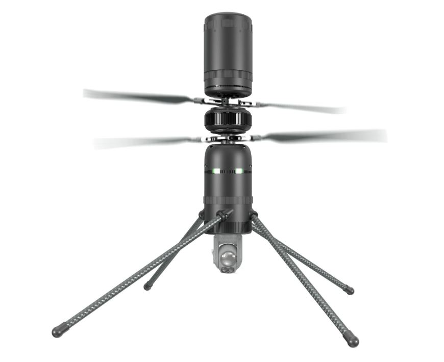 This is the Spirit UAV: a high performance aircraft for reconnaissance, surveillance, and search and rescue missions. This coaxial unmanned drone measures 12 x 4.2 inches. It has max payload capacity of 6.5lbs. It supports dual payloads on top and bottom.