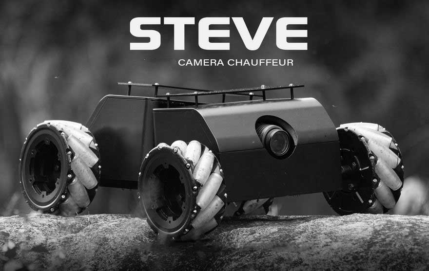 Meet Steve: a robot designed with filmmakers in mind. It is small enough to fit in the back of your car and can carry up to 20kg of weight. It has mecanum wheels to move in all directions. Steve comes with a safety cage for your camera. It is driven by Arduino.