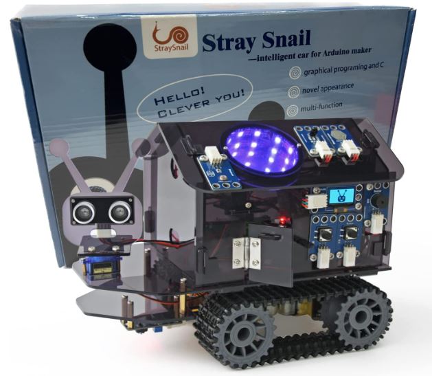 Here is another robot that teaches your kids coding. The Stray Snail 4WD Arduino Robot comes with iOS and Android control. This kit comes with 4 motors, 2 light sensors, a LED module, 1 x infinity tunnel, a buzzer, and various other sensors. It also has a Bluetooth module, OLED screen, and expansion board.