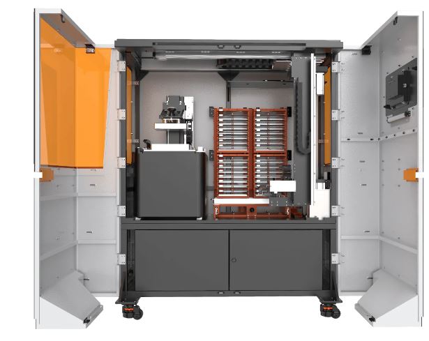 Meet the Structo ST-32: an automated MSLA 3D printer that allows continuous printing with minimal labor. This machine has a gantry system that automates the changeover process in between print jobs. Once a print job is completed, the parts are removed and stored in a magazine within the sell. A new sheet is then inserted to start a new job.