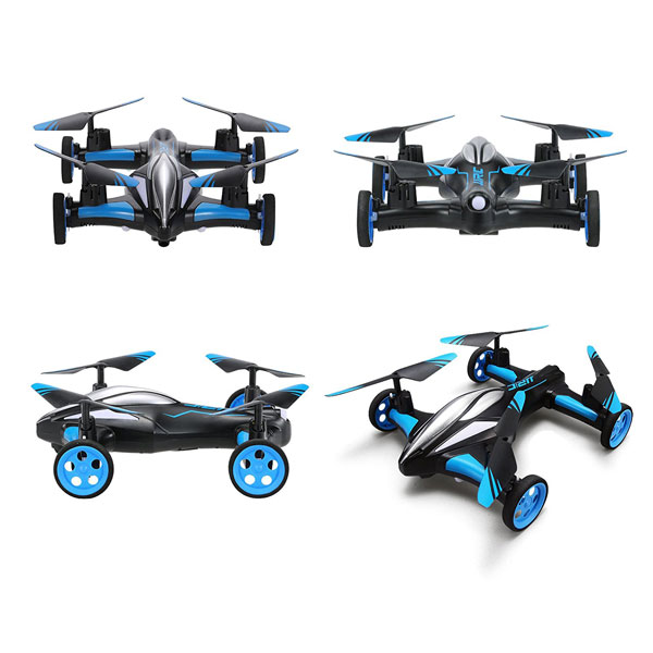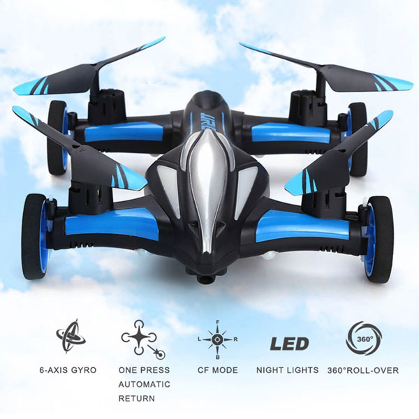 Meet the SZJJX Air-Ground Drone: an RC flying car that with land and air modes. It can perform 360-degree flips and rolls. This RC flying car has a 2.4HGz remote control with a range of over 200 meters. It features automatic return and a headless mode.