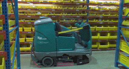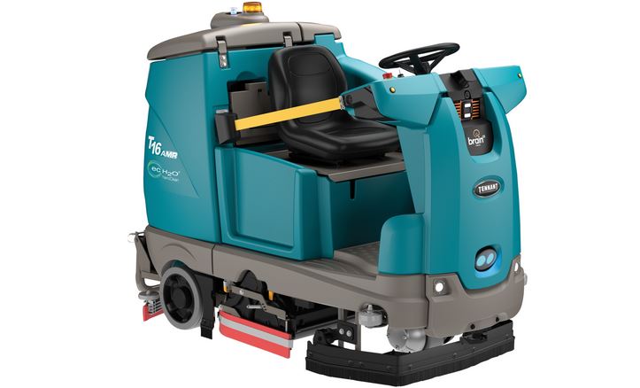 Here is a robotic floor scrubber designed for cleaning large spaces. The T16AMR Robotic Floor Scrubber has a wide scrub path and high tank capacity. It is designed to operate in complex environments without an operator. It connects to an onboard telemetry system for notifications.