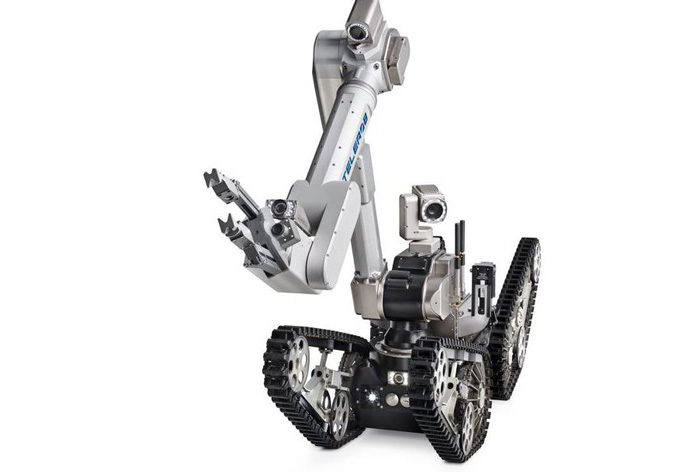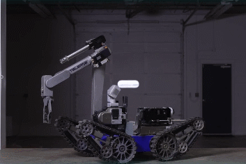 Meet the Telemax Evo Hybrid: a versatile UGV designed for bomb technicians. It comes with a 6-axis arm with automatic tool change and TCP control. It has max lifting capacity of 82lbs. This robot has a 4-track drive system with max speed of 6.2mph. It also comes with a 2-way audio module and HD pan/tilt camera.