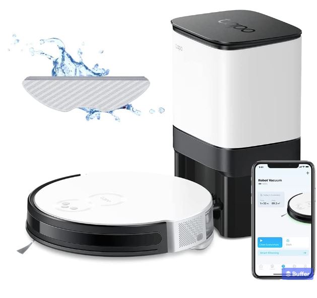 This is the TP-Link Tapo RV10 Plus: a smart robot mop and vacuum that gets rid of sticky mess and dirt on the floor. It uses a gyroscope smart navigation system for efficient zigzag planning. It has 4 suction modes for you to choose from and 3 levels of electronic mopping.