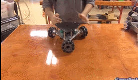 Here is another triangular robot with wheels that let it move in all directions. This Programmable Triangular Omni Wheel Vectoring Robot was built by SuperDroid Robots. It weighs 6.5 lbs and can support 10lbs of weight. It has IG32 24V 265RPM gear motors, Arduino Mega controller, 2200 mAh LiPo battery, and everything you need to get started. Example code is also available.