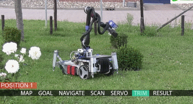 The robot navigates varying terrain, approaches rose bushes and boxwood topiary and trims them. The platform is based on the Bosch Indego robot lawnmower with 5 pairs of stereo cameras for 360-degree view.