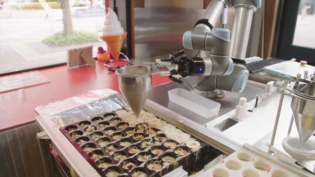 Robots are already capable cooking burgers, eggs, and other types of food. The UR Dumpling-Making Robot relies on AI and deep learning to replicate the movements of a Takoyaki chef. The robot arm pours oil and ingredients and rotates the dumplings.