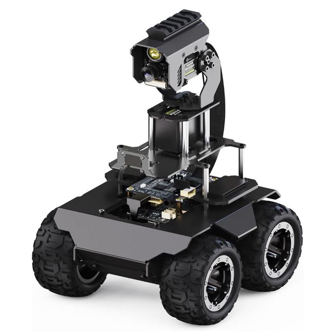 This is the Waveshare RaspRover: a Raspberry Pi powered robot that takes your coding to the next level. It comes with computer vision and dual controllers. It also has a pan-tilt module for the camera. This robot is ready for color, object and gesture recognition. It has an easy mounting plate and a Picatinny rail.
