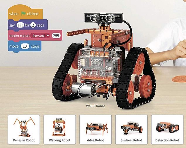 Here is another educational robot designed to teach your kids the basics of coding. The 6 in 1 WeeeBot Evolution STEAM robot has over 240 pieces and can be assembled in 6 robot forms, including a spider, penguin, or 3-wheel racing bot. These robots have an anodized aluminum structure. They are compatible with LEGO bricks.