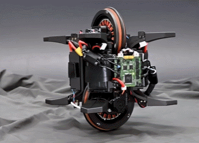 Meet the Wheelbot: a unicycle robot that can jump on one of its wheels and balance using brushless motors. It measures 22cm tall and has two identical wheels for balancing. Its 3D printed reaction wheels measure 10cm in diameter. Optical encoders record the motors’ rotational velocity while 4 x IMUs are used to sense orientation.