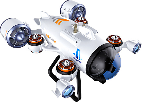 Meet the WhiteShark MAX: a remote-controlled submarine that can dive up to 100 meters. It has a 9-axis motion compensation system and can detect sonar beacons with image recognition algorithms. The robot is available in 2D and 3D dual camera configurations.