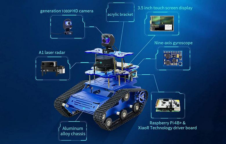 Here is another AI robot with Raspberry Pi for more advanced coding projects. The XiaoR Geek RPi Robot is powered by a Pi 4B board. It comes with a 1080p HD camera, Rplidar A1 radar and 3.5″ touchscreen display. It comes with SLAM navigation for autonomous movement.