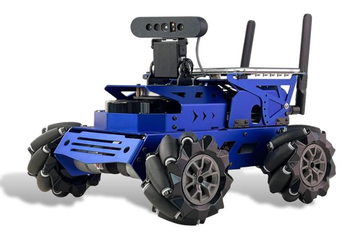 This is the XiaoR GEEK ROS2 Hunter: a Jetson Nano powered robot designed for more advanced students. It is available with 4 chassis options. This particular one has mecanum wheels for omnidirectional movement. This robot has a 2DOF 3D Depth camera and a foldable touchscreen display. It is capable of LiDAR and RTAB 3D mapping navigation. With Mediapipe, you get face, edge and color recognition.