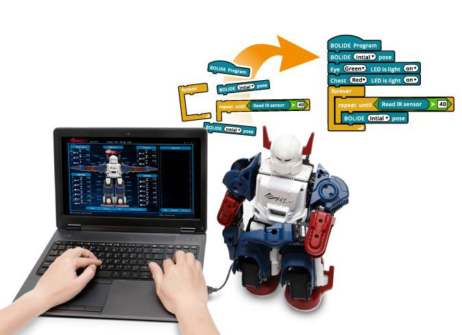 Meet the XYZrobot Bolide 2.0:a humanoid robot with 18 DOF that can mimic precise human movements. It comes with accelerometer, IR sensor, and everything you need to get started. The robot comes with LED eyes, 2W speaker, and app control.