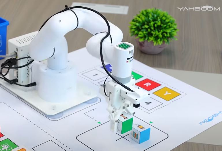 This is the Yahboom JetCobot: a 7-axis robotic arm with Jetson Orin Nano with a configuration similar to that of UR robots. This educational robot runs Ubuntu 20.04. It can achieve mm level positioning and work safely around humans. It supports ROS and multiple programming languages. This robot can be controlled with an Android app or game controller.
