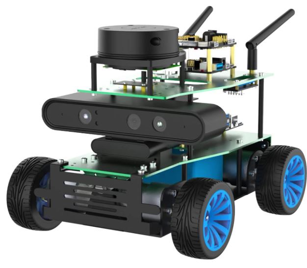 This is the Yahboom Rosmaster X1: a Jetson Nano robot that takes your Python coding to the next level. It has an aluminum alloy construction with non-slip rubber tires. It can be used with optional modules such as a 7-inch display, voice module, LiDAR and depth camera for complex tasks.