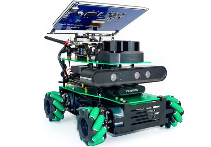 The ROSMASTER X comes with a depth camera, LiDAR, and voice interaction module. It is ready for ROS. You can control this robot with your smartphone or a joystick. It is ready for AI deep learning projects. It also has a 7 inch LCD screen.