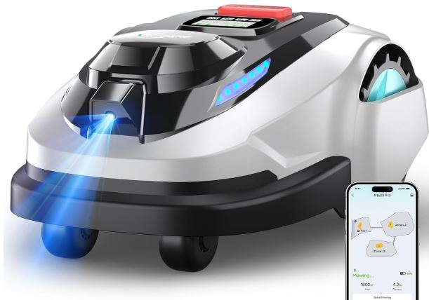 This robot can recognize and avoid over 300 types of obstacles. You can use your phone to customize mowing schedules, adjust cutting modes, and track mower progress. The N1600 PRO has 7.09″ cutting width. It is smart enough to stay off of non-grass areas.