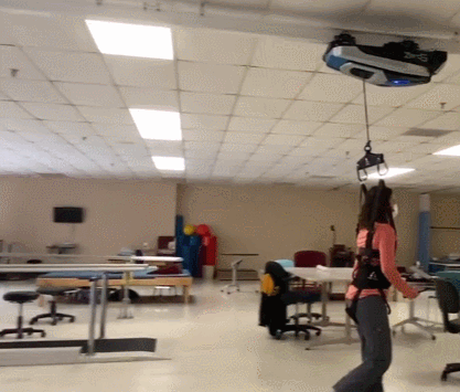 The ZeroG robot moves along a custom ceiling track. It allows patients to practice gait, balance, and perturbation.